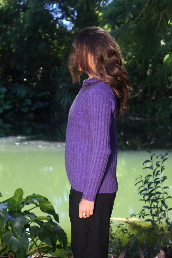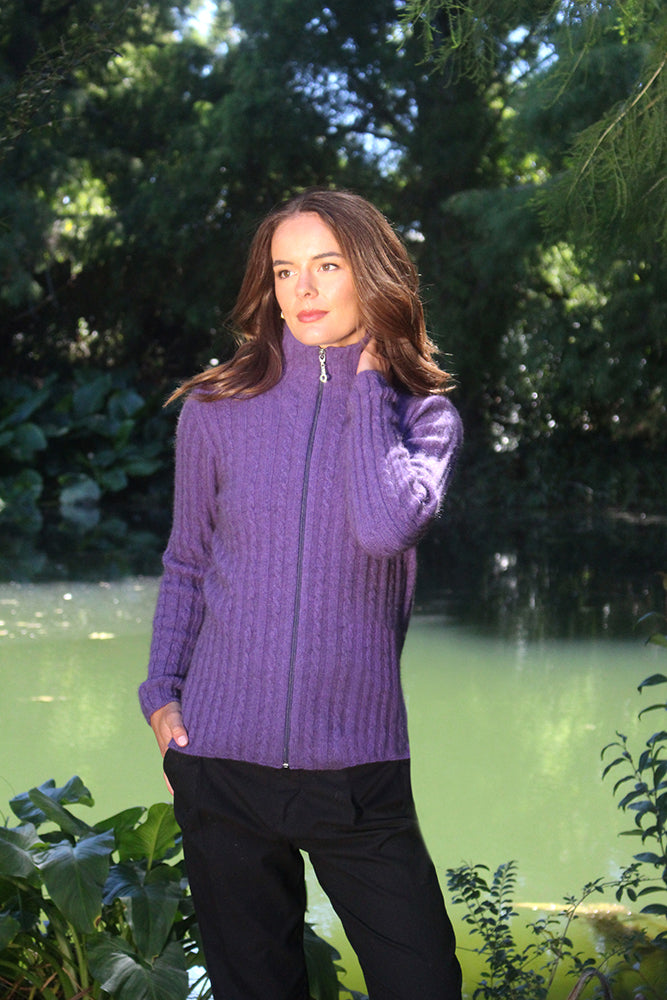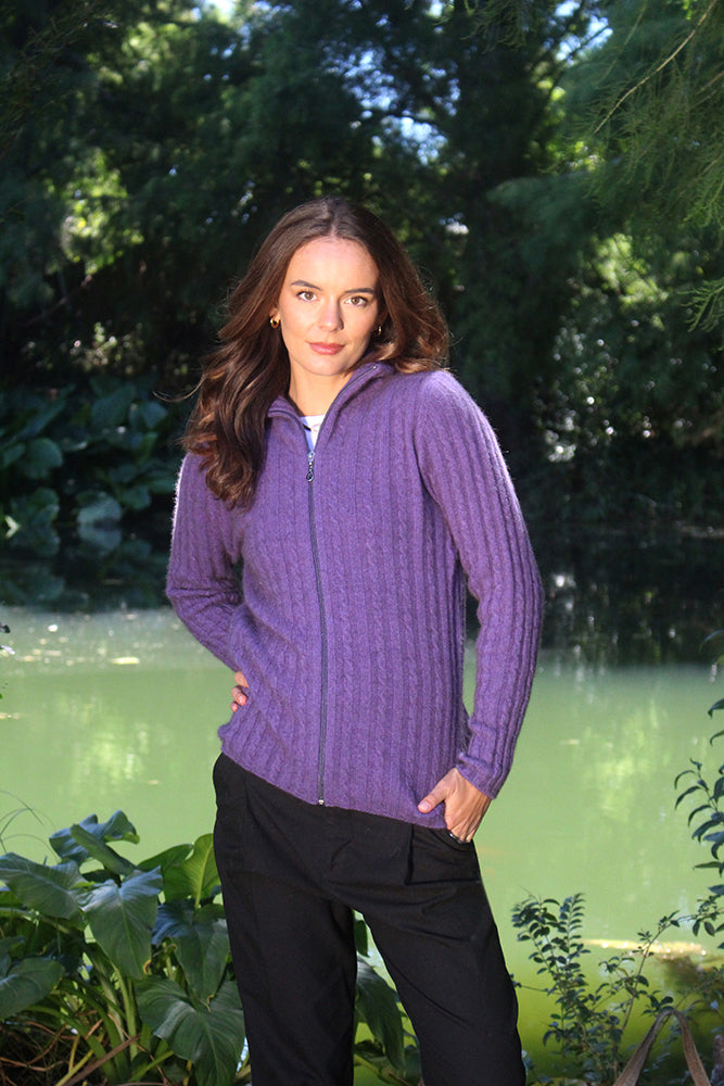 Lothlorian Rib Cable Jacket. Shaped jacket with collar featuring cable detail on alternate ribs. We have combined the qualities and natural warmth of fine Merino Wool with the softness of Possum fur and added a little nylon.